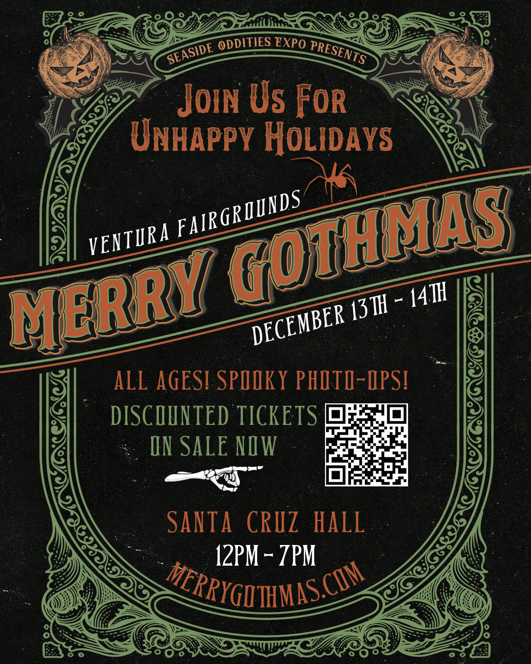 Step into a twisted winter wonderland where Halloween haunts collide with holiday cheer. Merry Gothmas is a family-friendly celebration of the dark and delightful, featuring eerie artists, wickedly wonderful creators, and haunted holiday treasures to shop during the Unhappy Holidays.