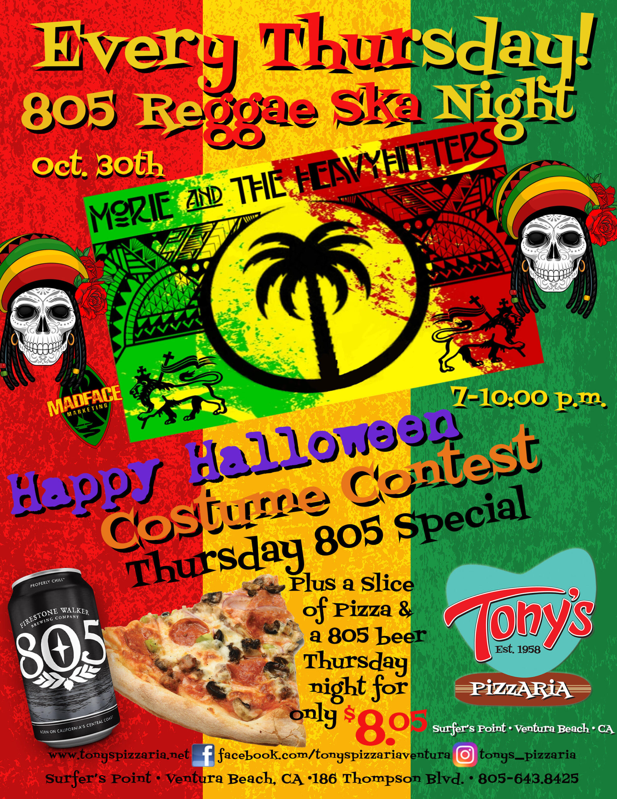 Every Thursday at Tony’s Pizzaria: 805 Reggae Ska Night from 7pm-10pm! Enjoy live music, a costume contest, and more!