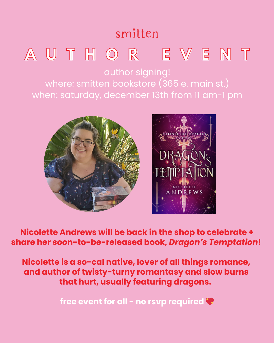 She’s back! Come get to know author Nicolette Andrews and her soon-to-be-released book, Dragon’s Temptation. Free event for all!