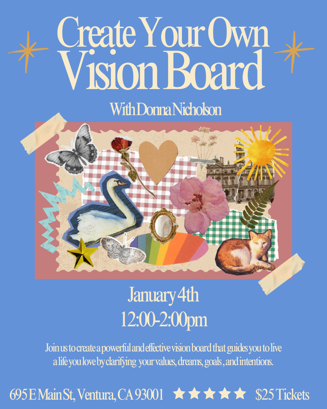 This in-person workshop will walk you through a step-by-step process for creating a powerful and effective vision board that guides you to live a life you love by clarifying values, dreams, goals, and intentions. Prior to the event please ponder “What are six simple pleasures that make me smile?” Materials will be provided–magazines, glue sticks, scissors, markers, crayons, poster board–all the essentials for creating an awesome vision board.