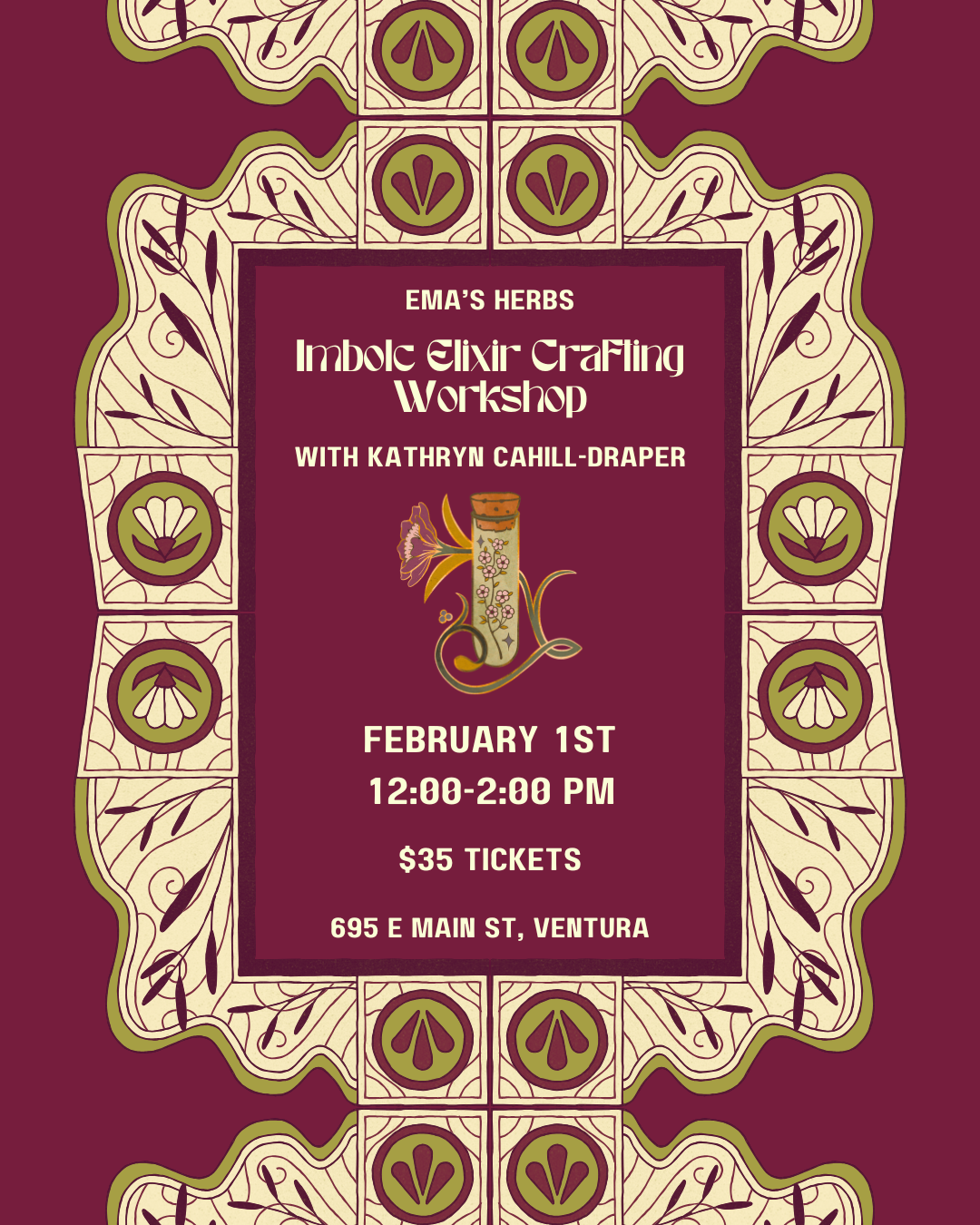 Join herbalist and green witch Kathryn Cahill-Draper in an afternoon of honoring the return of the season of light after the dark days of winter. Together, with the aid of herb crafting, intuition, and the unique inner magic of each member of our circle, we will brew a bespoke healing elixir to brighten the spirit, replenish our immune systems, and fill our hearts and minds with inspiration for the year ahead! Each participant will leave with a serving of Imbolc Elixir in a reusable 5oz glass potion bottle, which will be decorated during our gathering, as well as the recipe for our Elixir.