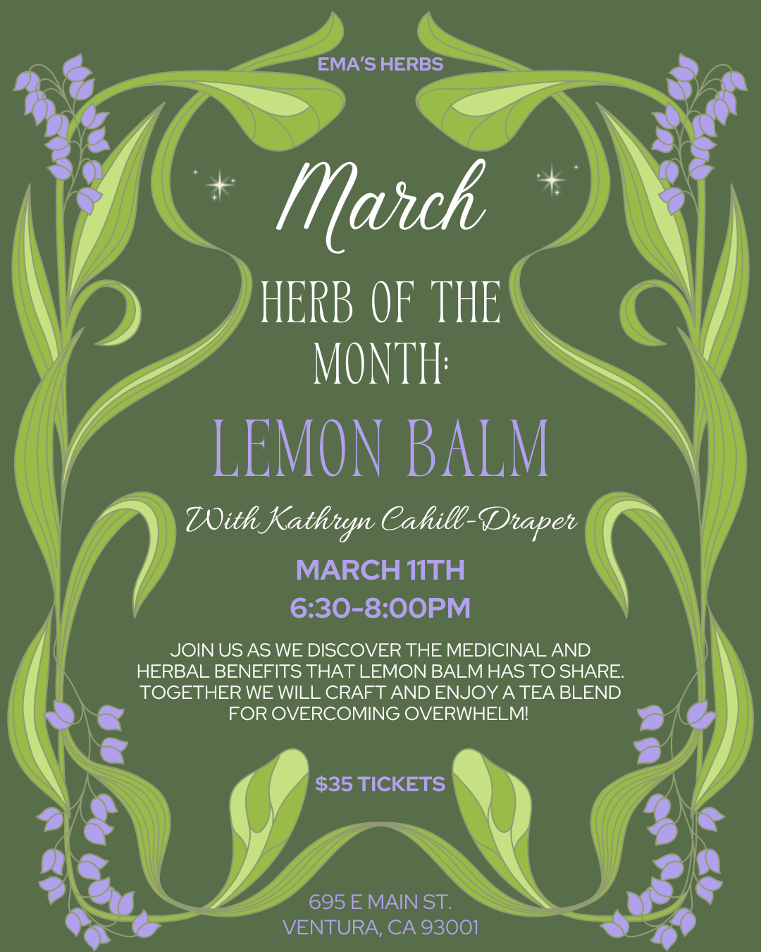 Known by the folkloric name, Heart’s Delight, this month we will be reflecting on the lessons of Lemon Balm! This solar plexus supporting herb offers her cooling energy as respite from the fiery and occasionally overpowering energy that Aries season has in store. As an attractor of pollinators, Lemon Balm aids us in welcoming in springtime as a season of growth and creativity, while easing overthinking and rumination. Join herbalist Kathryn Cahill-Draper as we discover the medicinal and herbal benefits that Lemon Balm has to share, as we craft and enjoy a tea blend for overcoming overwhelm!