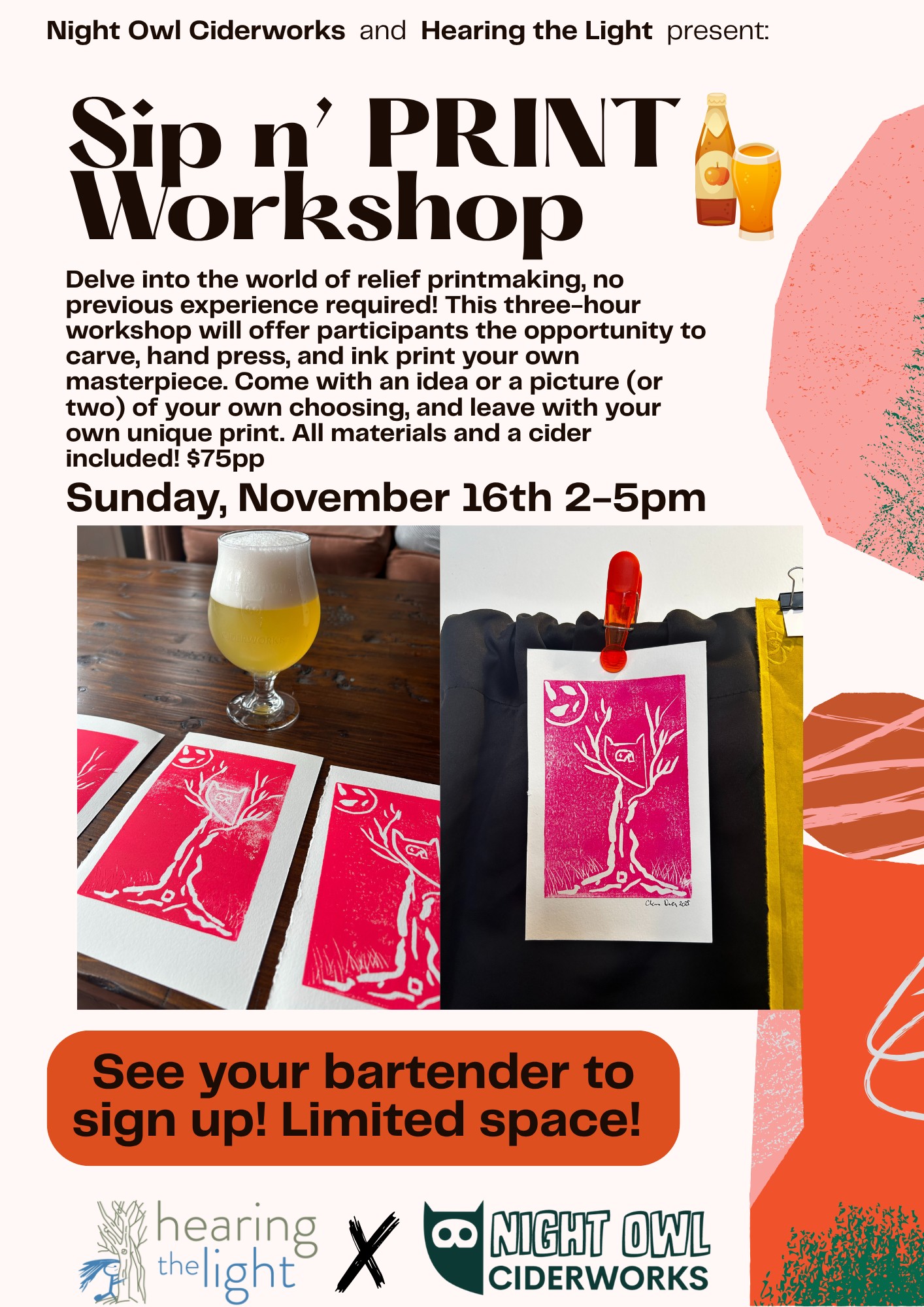 Unleash your creativity with a cider in hand! Join Night Owl Ciderworks and Hearing the Light for a hands-on relief printmaking workshop—no experience needed. Learn how to carve, hand press, and ink your own design while enjoying a refreshing craft cider.