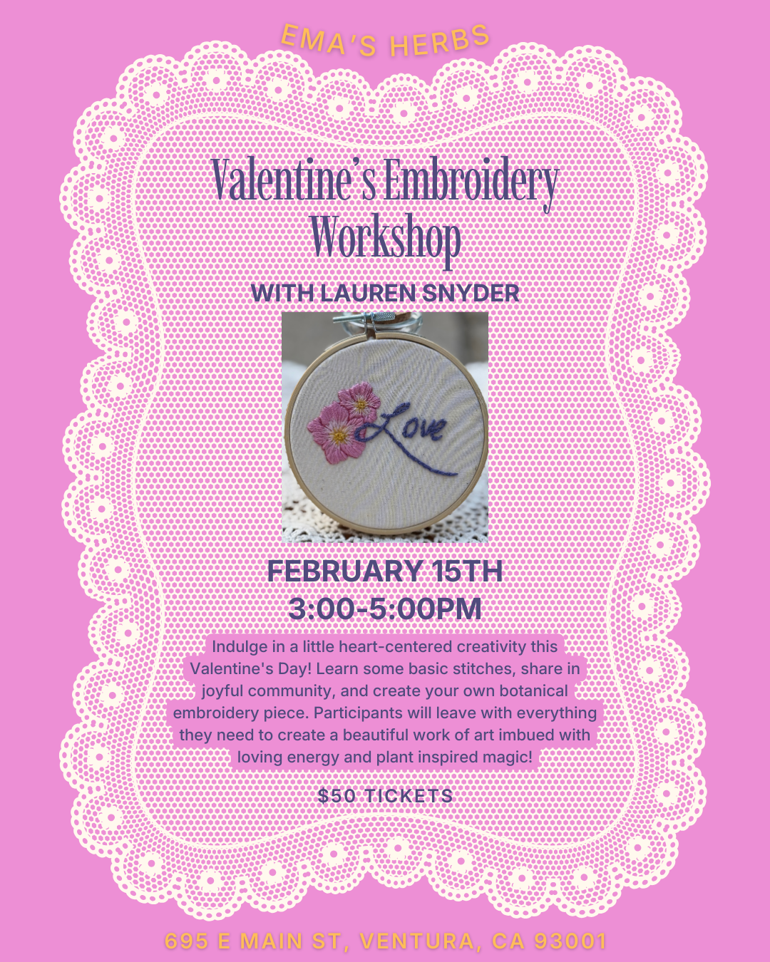 Indulge in a little heart-centered creativity this Valentine’s Day with another Botanical Embroidery workshop! Join local herbalist and botanical artisan, Lauren Snyder, as you learn some basic stitches, share in joyful community, and create your own botanical embroidery piece. All materials will be provided and participants will leave with everything they need to create a beautiful work of art imbued with loving energy and plant inspired magic. All levels of experience are welcome!