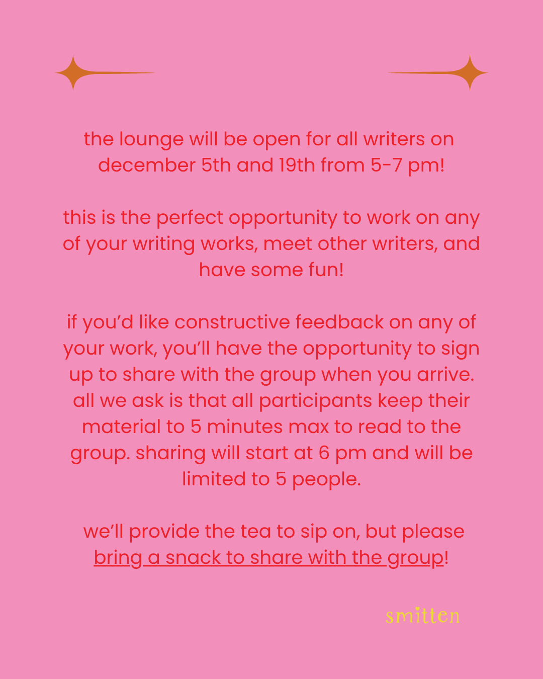 Calling all writers – come check out Smitten’s Writing Club! Open to writers at all levels. No RSVP is required, just show up and bring your writing projects.